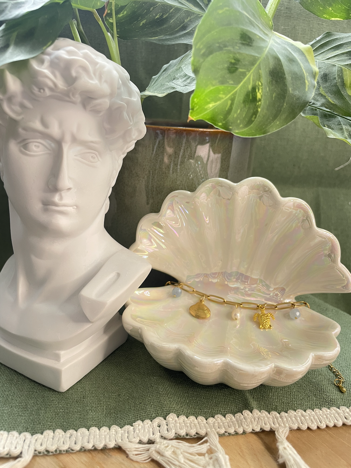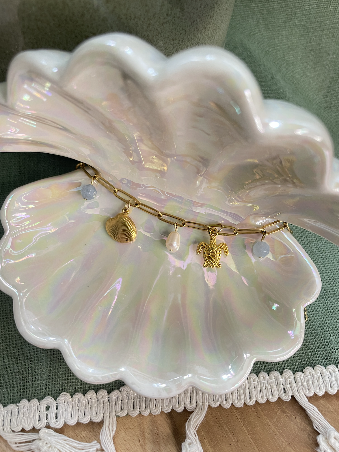 Breloques coquillages en acier inoxydable et tortues en alliage de zinc, perles de cultures d'eau douce et perles d'aigue-marine.